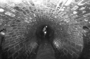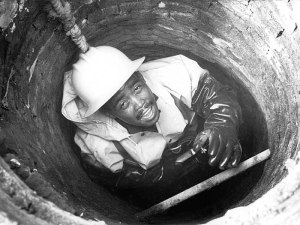 Sewer crawler Clarence Baskerville checks tunnel for leaks. He has faced the dangers of working in sewers for past three years, 1971