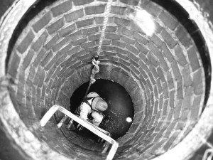 General view of sewer looking up manhole as other Water Dept. personnel look down.