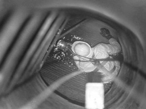 Sewer crawler Tom Cross, heading down the manhole at 26th and Grays Ferry, 1982
