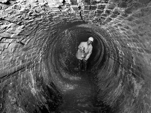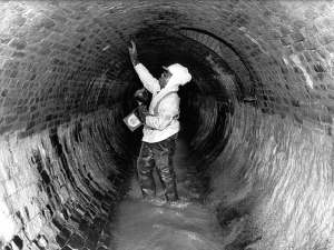 Norman Lofton inspects sewer at Ditman and Sheffield, 1987